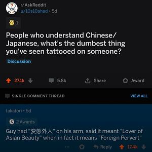 I lived in Japan when Ariana Grande got her 七輪 (shichirin) tattoo. She thought it meant 7 rings but it means charcoal grill. All of my Japanese friends brought it up to me and were laughing at it. It even made the news in Japan. I remember going to meet with a friend at a cafe and she immediately pulled up the tattoo photo and started making fun.
