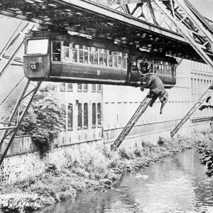 During a durability display of the Wuppertaler Schwebebahn the elephant Tuffi panicked, smashed through the window and fell into the Wupper.