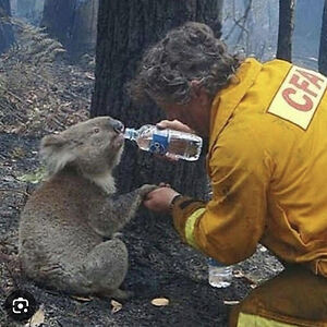 Firie giving a koala some water in the 2009 fires. I remember this photo being all over the news.